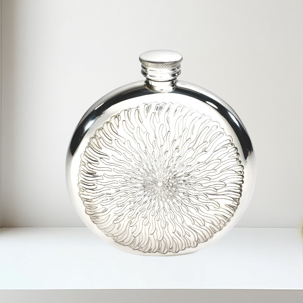 6oz Round Sunfish Pewter Flask: The '6oz Round Sunfish Pewter Flask' is a sleek pewter hip flask, ideal for pockets and perfect for gifting to whisky lovers or best men.